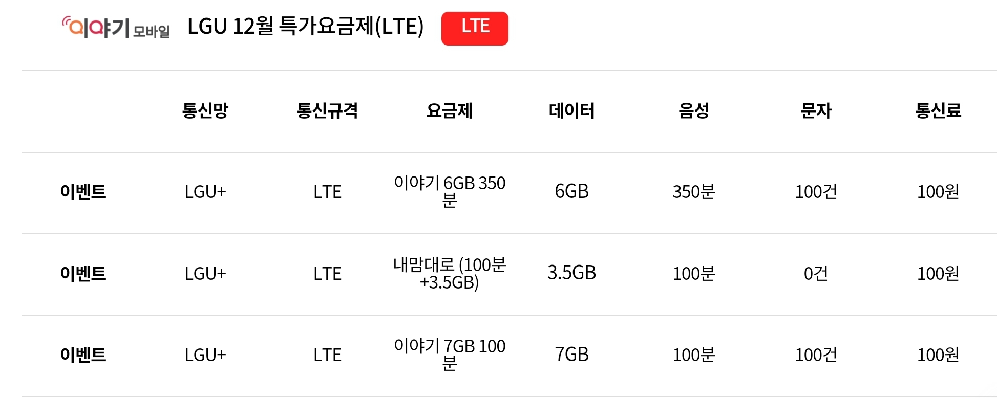 이야기 모바일에서 진행하는 LGU+ 12월 특가 요금제 입니다. 100원 요금제 3종이 있습니다.