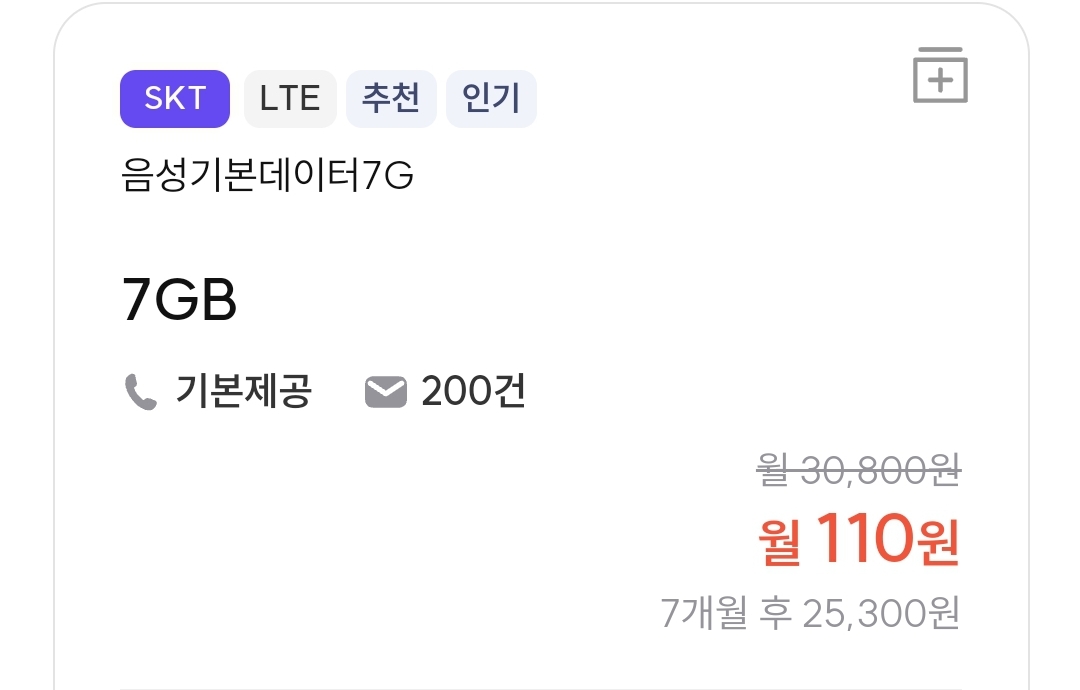 데이터 7GB, 통화량 무제한(부가 음성 30분) , 문자 200건
